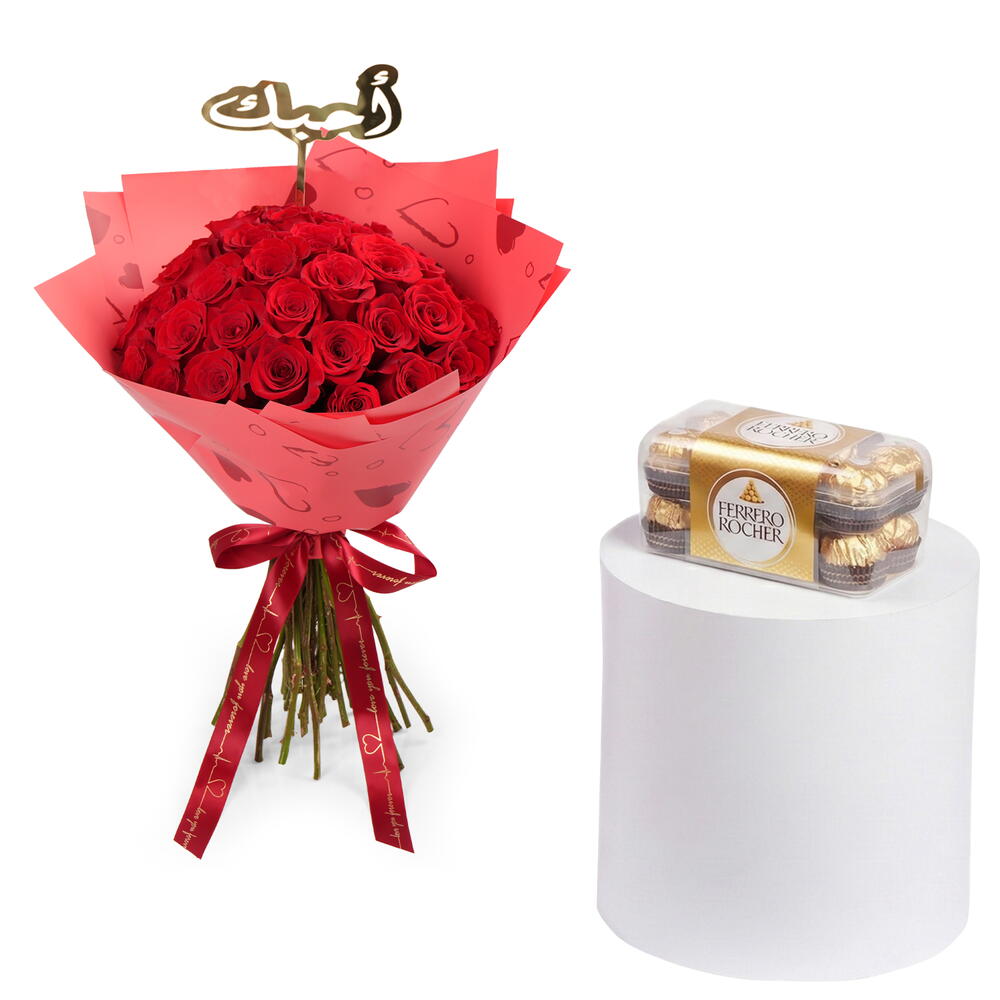 Make an unforgettable statement of love with our 35 Red Roses Bouquet with 16 pieces of Ferrero Rocher combo, the ultimate symbol of passion, admiration, and devotion. Each rose is carefully hand-selected for its rich, velvety petals and deep crimson hue, arranged in a luxurious, full-bodied bouquet that radiates romance. Wrapped elegantly with premium paper and a satin ribbon, this bouquet is perfect for Valentine’s Day, anniversaries, or any moment when you want to truly sweep someone off their feet. Highlights: 35 fresh, premium red roses with Love You arabic Tag and 16 pieces of Ferrero Rocher Luxurious wrapping with satin ribbon Hand-delivered with care Perfect for grand romantic gestures and special occasions When words aren’t enough, let 35 roses say it all.