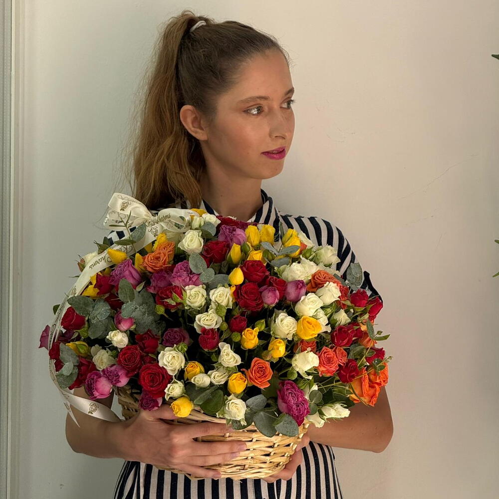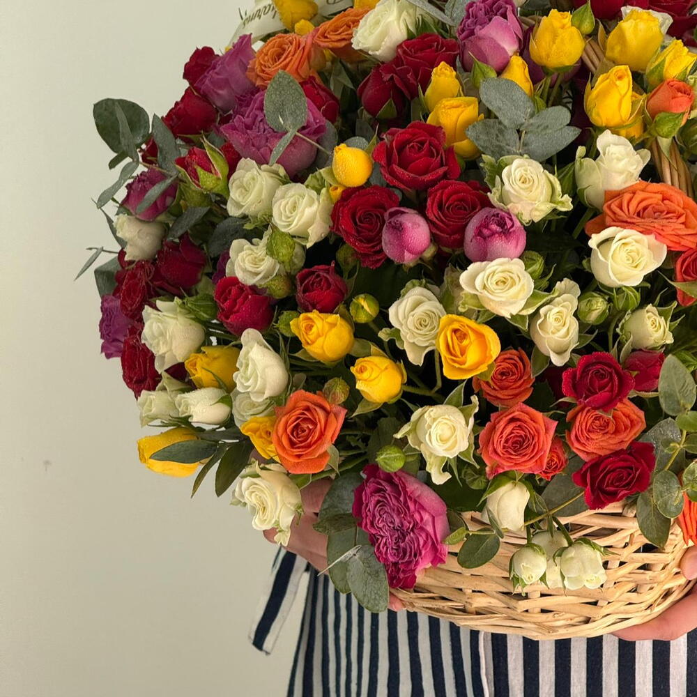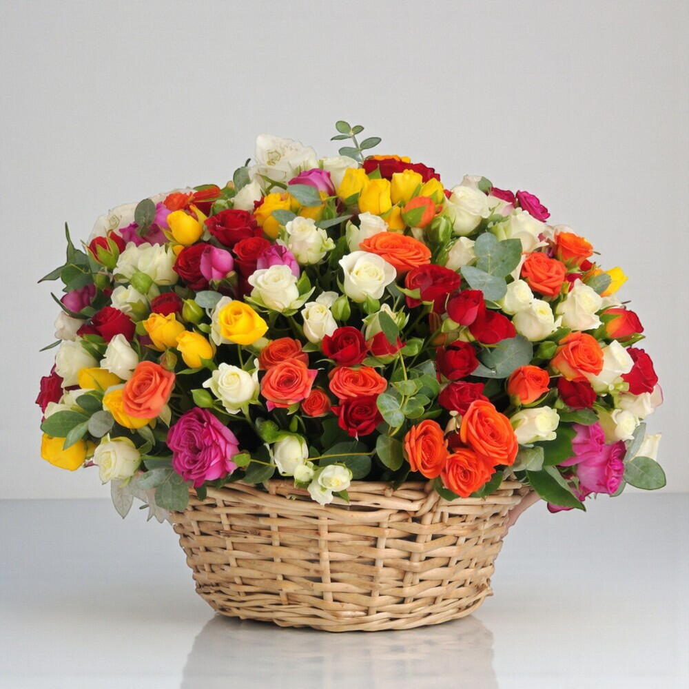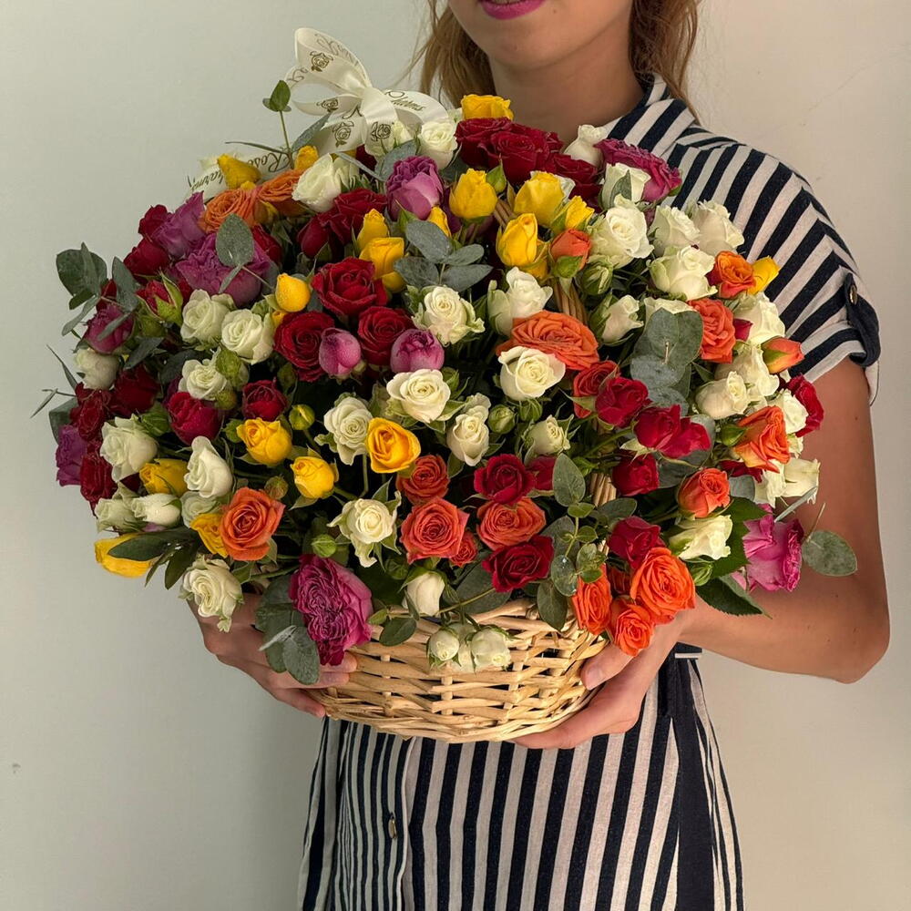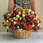 Ribbon - 1 pcs Eucalyptus - 8 pcs Basket - 1 pcs mixed colour roses - 35 pcs mixed colour spray rose - 16 pcs
