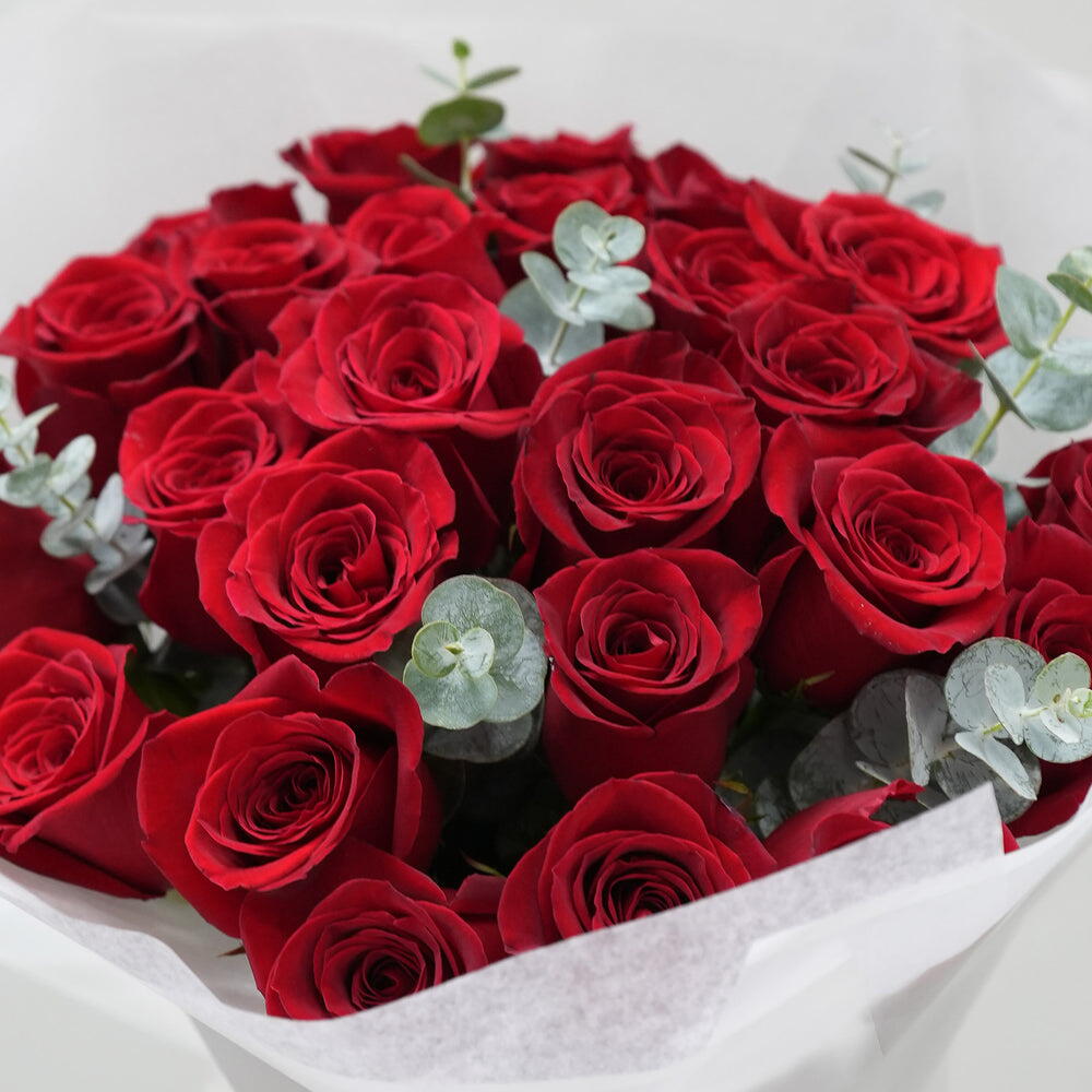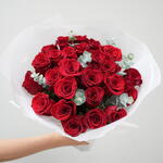 Immerse yourself in the exquisite charm of this mono bouquet, expertly layered with 39 vibrant red roses. Each bloom is hand-selected to ensure perfection, creating a stunning visual spectacle. Complementing the ravishing reds are 5 pieces of Eucalyptus leaves, their muted tones bringing a delicate balance and enhancing the roses brilliance. This bouquet is not just a gift, its a meaningful gesture that speaks volumes of your sentiments.