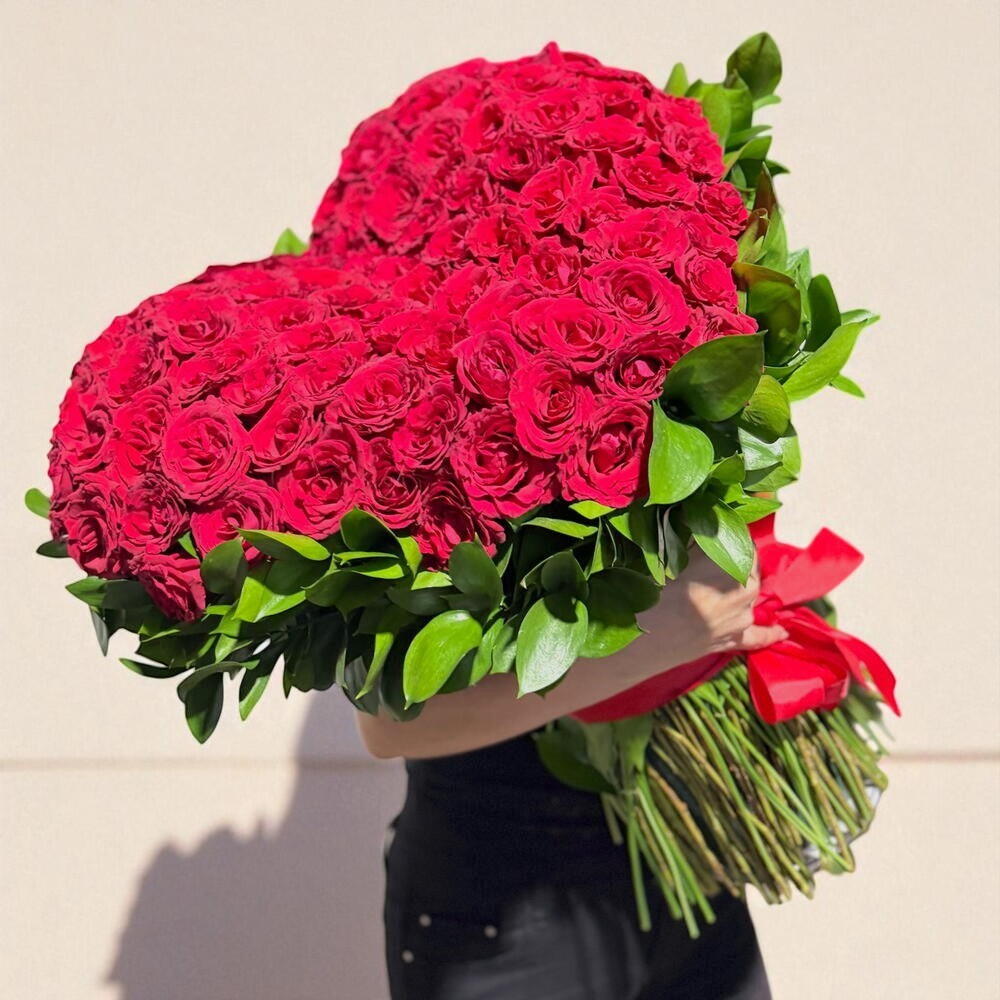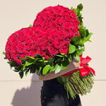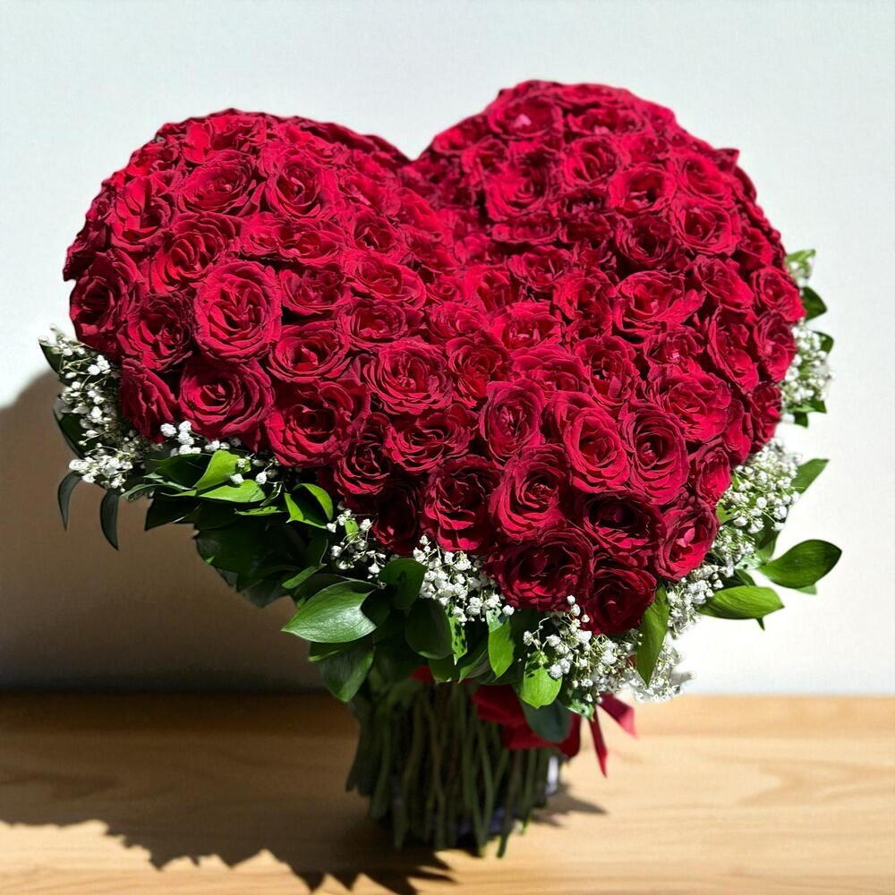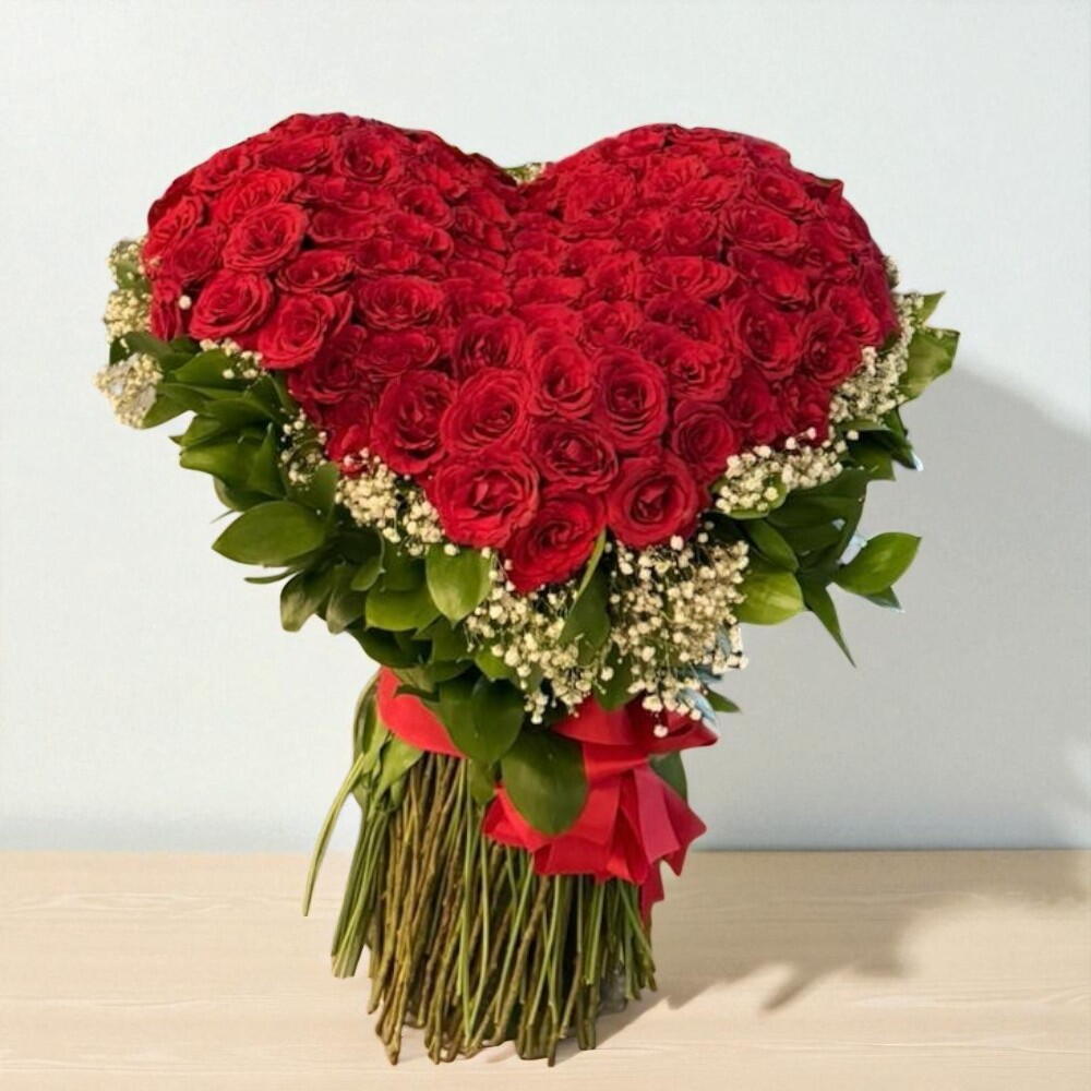 Ignite your romantic spirit with our florists special arrangement composed of 100 stunning red roses. Carefully placed on a sturdy heart-shaped base, each rose symbolizes a facet of your love, making this bouquet a perfect declaration of your feelings. Accented with 28 grams of delicate gypsophilas, this arrangement beautifully embodies the beauty of love in its purest form. Ideal to surprise your loved one on any occasion, this bouquet offers everlasting memories. For an impressive gift of love or an enchanting centerpiece, this florists special composition captures the passion and sweetness of true love.