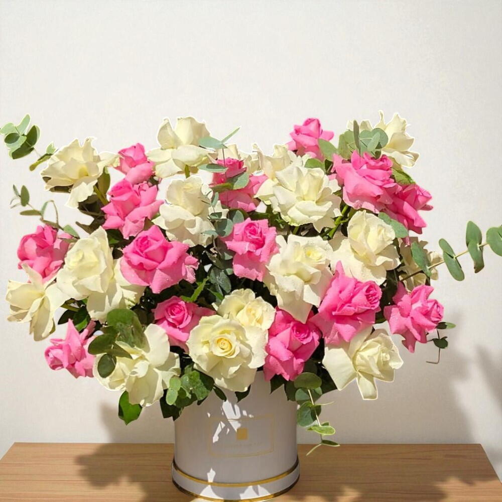 A perfect blend of tenderness and elegance, this luxurious box features charming pink and creamy white roses arranged with lush greenery. The soft contrast of the blooms creates a visually stunning bouquet that radiates warmth, affection, and sophistication. Presented in a sleek white hatbox with golden accents, it makes a striking gift for any special occasion. Whether youre celebrating love, friendship, or simply wishing to brighten someones day, this arrangement speaks straight to the heart. Its timeless beauty will leave a lasting impression. Let this bouquet be your message of grace and joy.