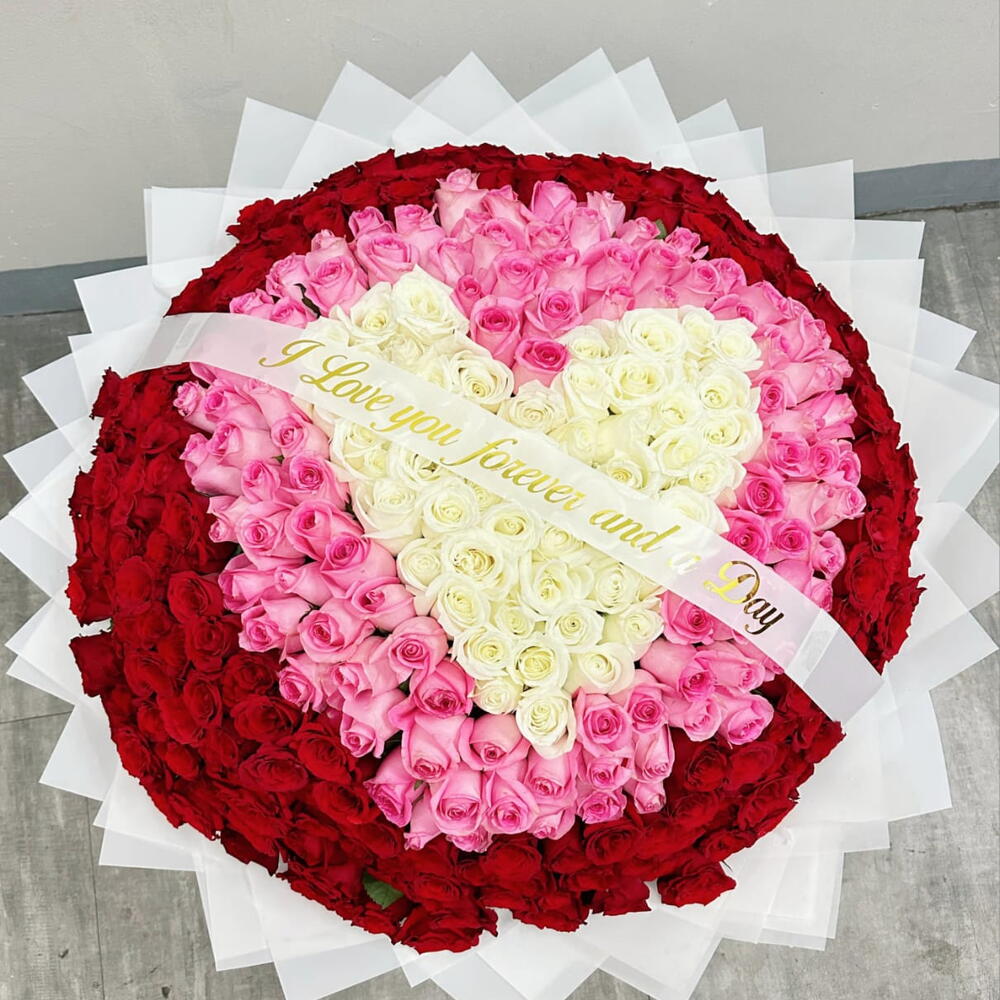 red roses - 230 pcs pink roses - 101 pcs white roses - 70 pcs customized ribbon - 1 pcs white pepper - 70 pcs