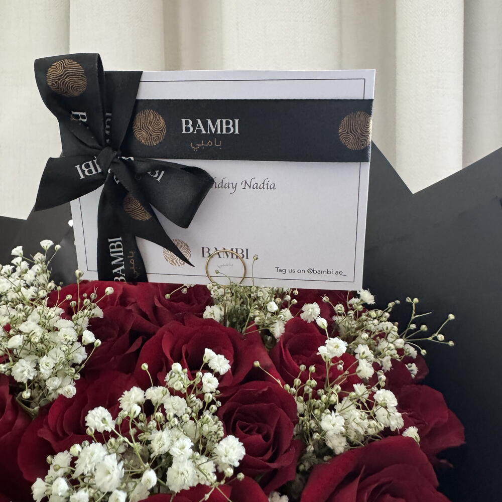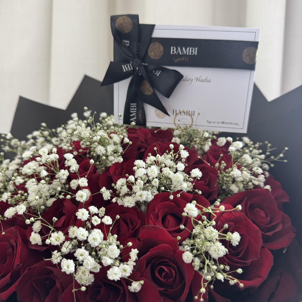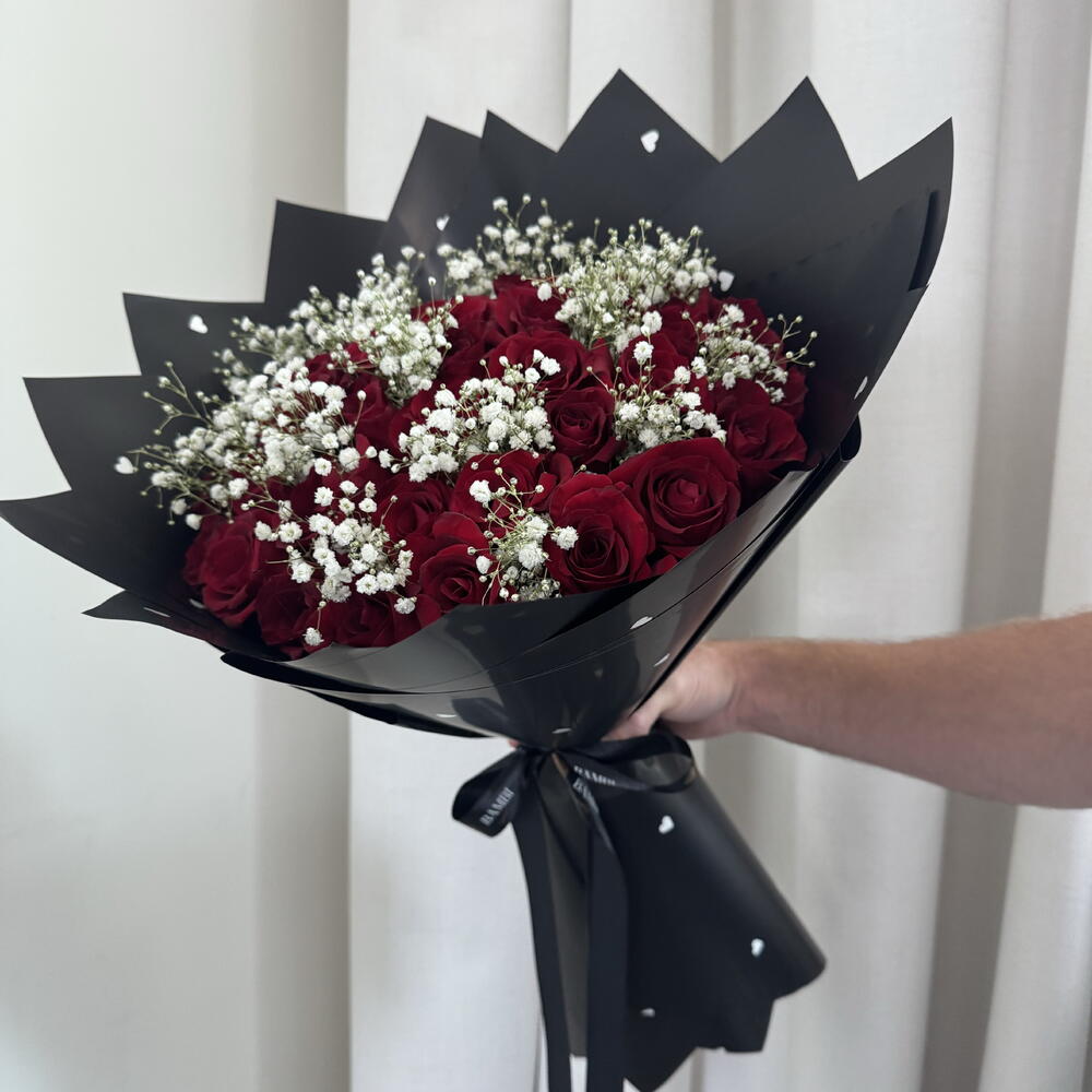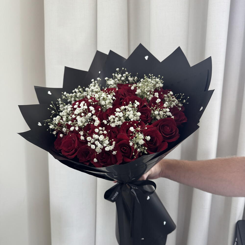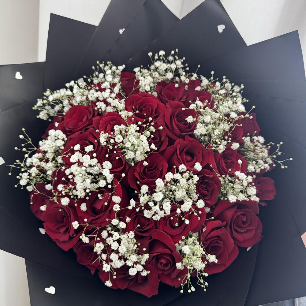 Unfold the magic of affection with this exquisite Mono Bouquet featuring 45 scarlet roses, beautifully complemented with a touch of babys breath. All gracefully encased in a black wrapping paper adorned with delicate white hearts. Accompanied by a bespoke message card, this bouquet is not just a gift, its a heartfelt emotion ready to unfold countless joy and love.