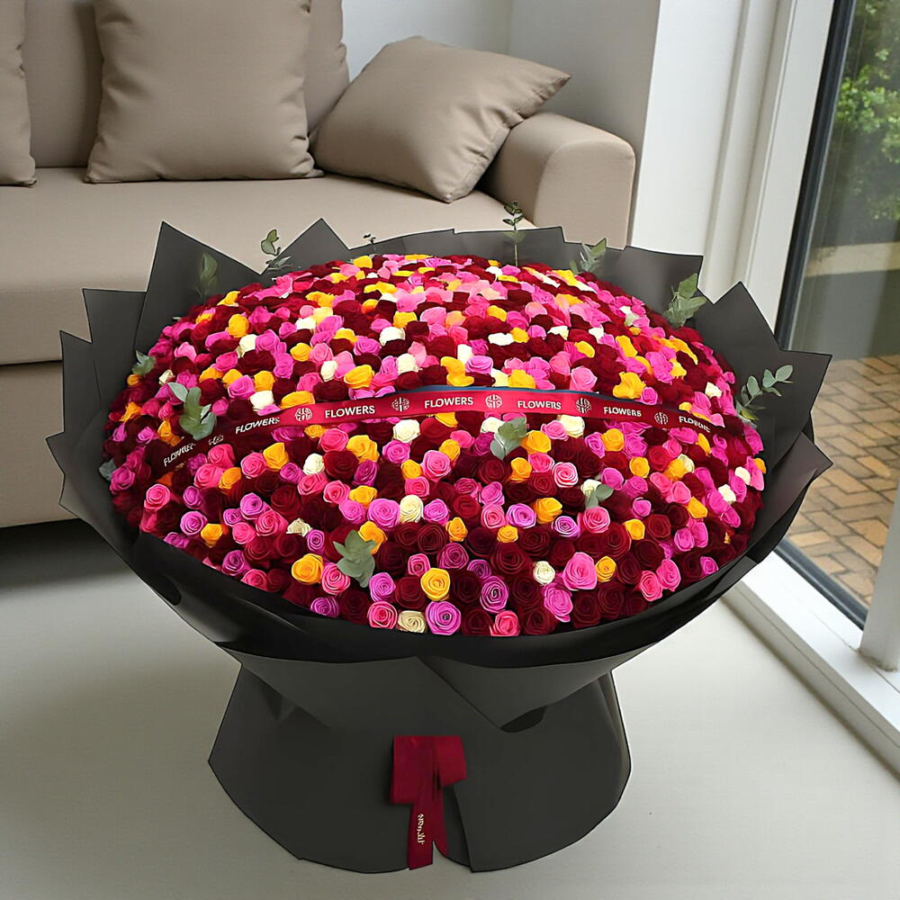 Red ribbon - 1 pcs black wrapping - 10 pcs mixed roses - 451 pcs floral tray 55cm - 1 pcs