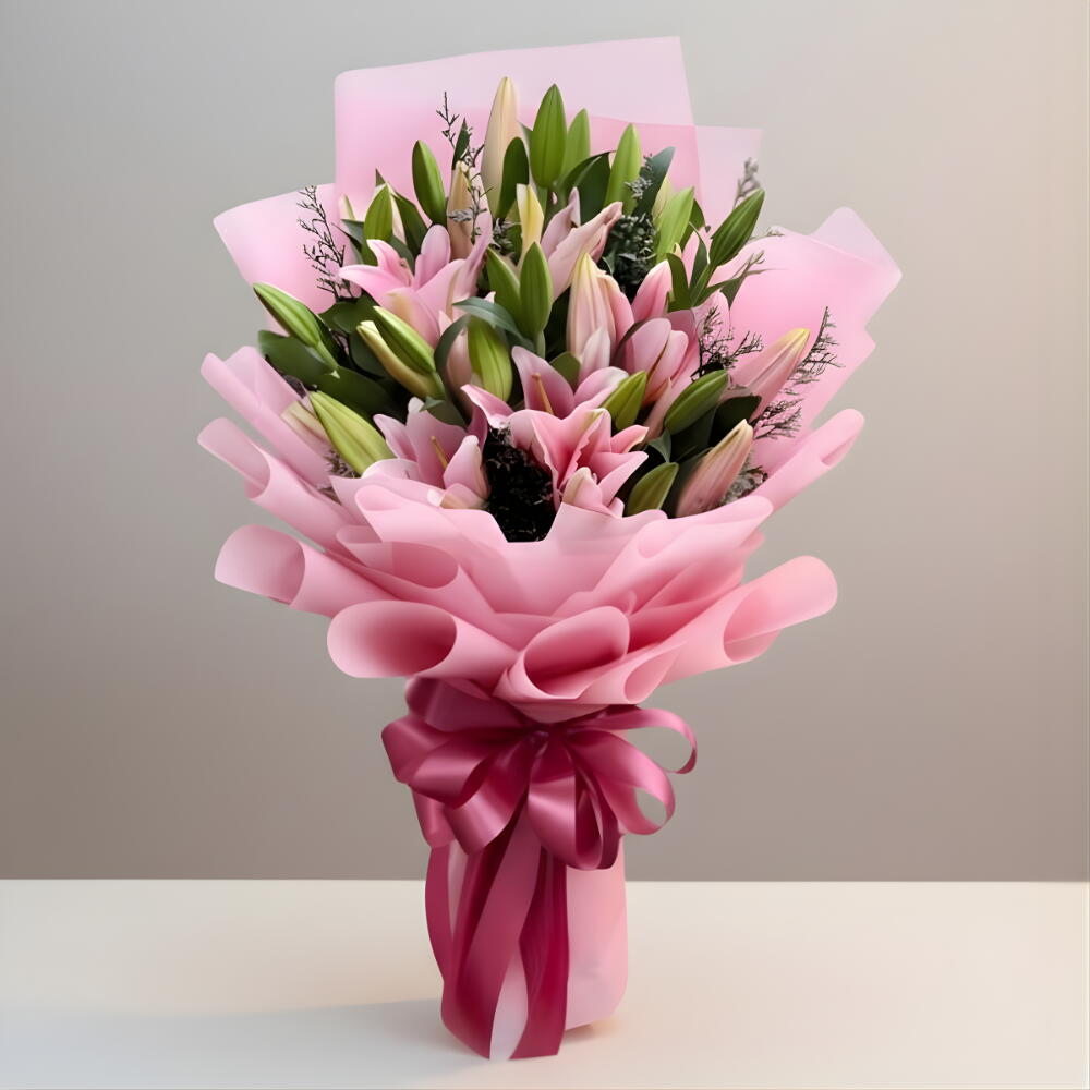 Bouquet of 5 pink lilies with caspia fillers in a nice wrapping. Graceful bouquet of 5 pink lilies paired with delicate caspia fillers, beautifully wrapped for a soft and elegant presentation—perfect for any heartfelt occasion. pink lilies, lily bouquet, caspia fillers, elegant flowers, fresh bouquet, floral gift, soft pink flowers, wrapped bouquet Keep in a cool place, trim stems and change water regularly, avoid direct sunlight, and remove pollen from lilies to extend freshness.
