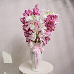 Ribbon - 1 pcs flower vase - 1 pcs stems of cymbidium orchids (pink and white) - 5 pcs