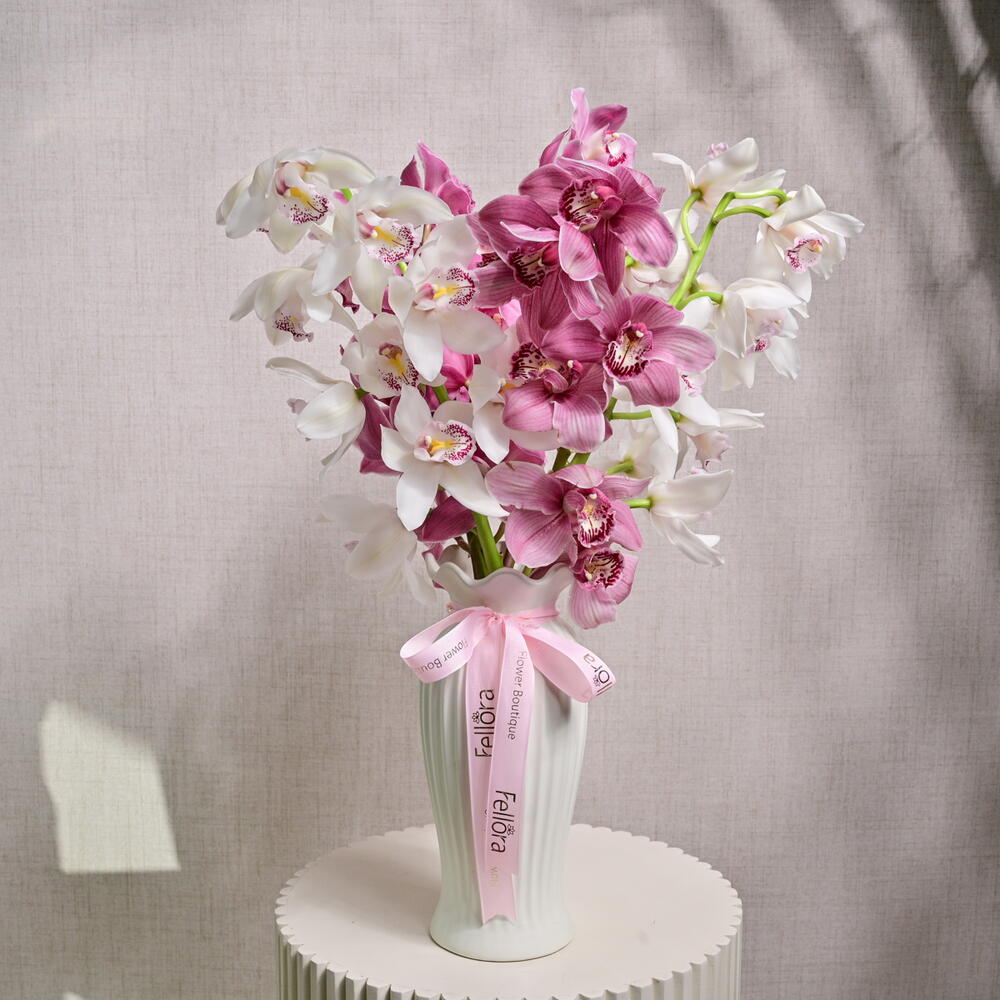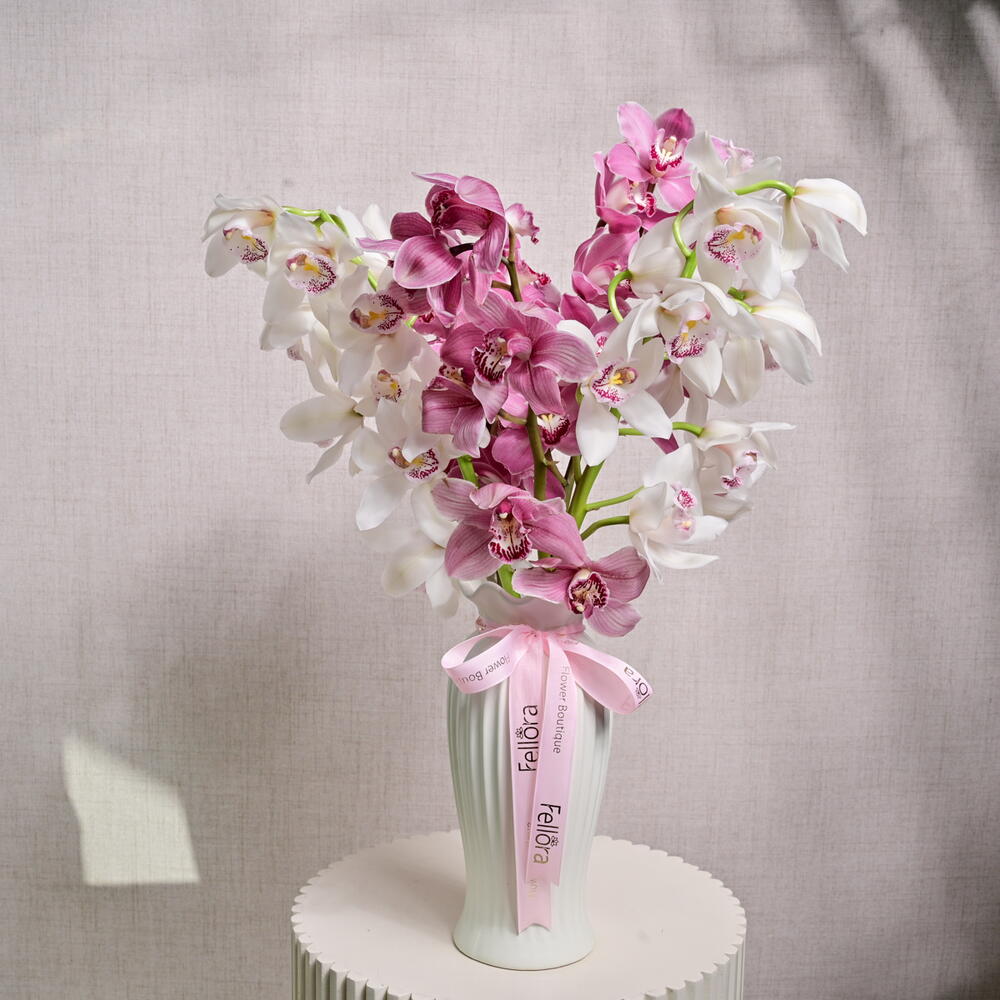 A stunning arrangement featuring a blend of delicate pink and white Cymbidium orchids, bringing a touch of elegance and sophistication to any setting.