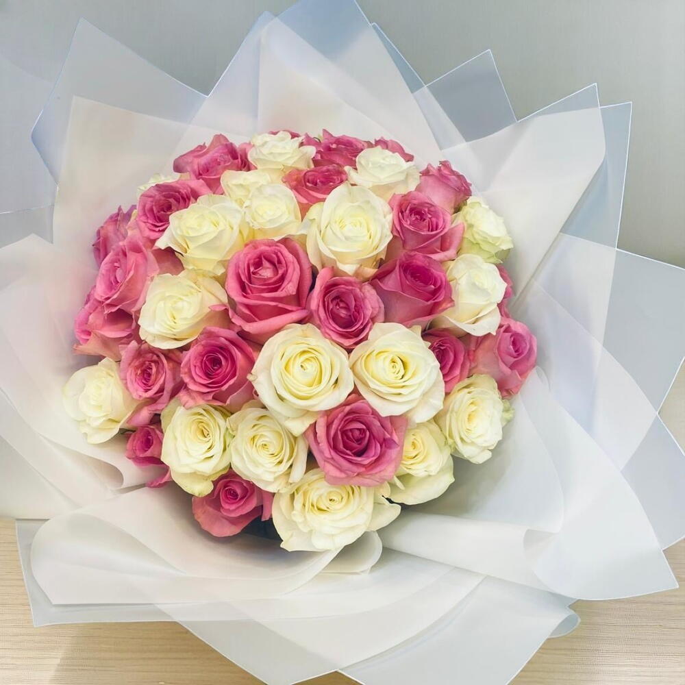 Celebrate timeless elegance with our Eternal Grace bouquet – a luxurious arrangement of 50 premium roses in a dreamy harmony of soft pink and creamy white hues. Perfectly wrapped in elegant white paper, this bouquet is ideal for anniversaries, engagements, weddings, or simply expressing heartfelt emotions with style. Care Instructions: To keep your roses fresh longer, place them in a clean vase filled with cool water. Change the water every 2 days, and trim the stems at a slight angle before placing them back. Avoid direct sunlight, heating vents, and drafts. For an added touch of freshness, mist the petals lightly in dry environments.