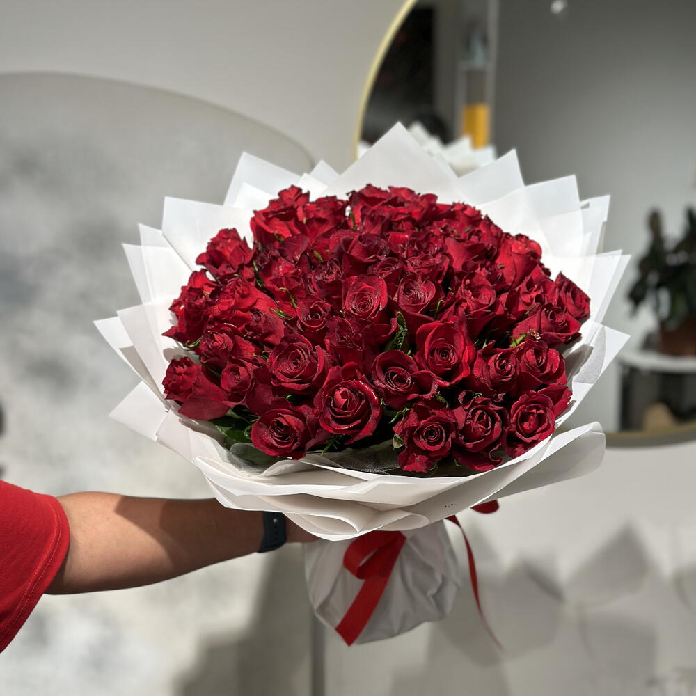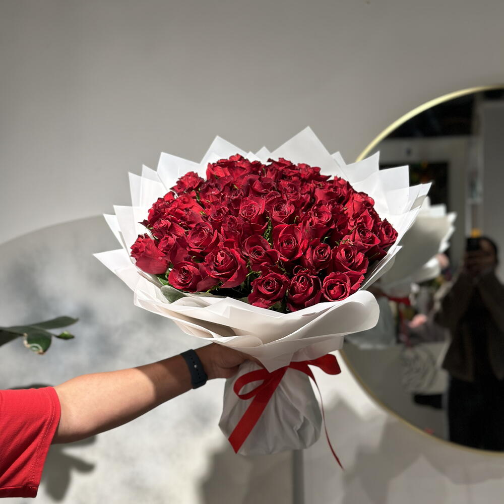 Indulge in the classic elegance of 50 hand-picked red roses, meticulously arranged by our expert florists. Perfect for expressing deep sentiments, these charming roses will add a dramatic flair to any occasion. From their lush, velvet petals to their intoxicating fragrance, each bloom embodies the enduring romance of the classic red rose. A truly captivating florists special!