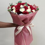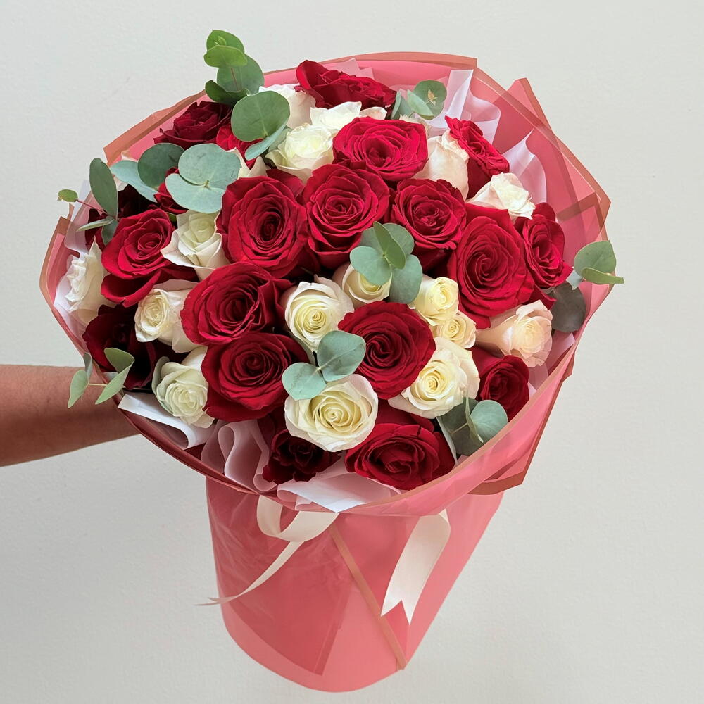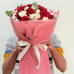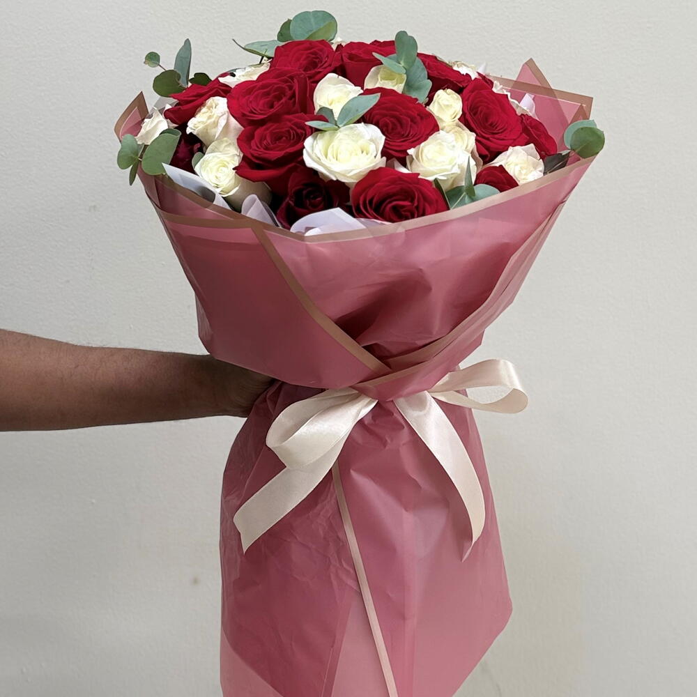 Envelop your senses in the captivating allure of our Florists Specials bouquet. Crafted meticulously with a generous assortment of 25 romantic red roses and 25 pristine white roses, this bouquet is a testament to natures intrinsic beauty. Each stem is handpicked, ensuring the highest quality roses that simply ooze freshness. The bouquet is polished off with a sleek ribbon and wrapped carefully in superior wrapping papers. With 5 pieces included, these intricate details make this not just a bouquet, but a gift-wrapped emotion. Delight in the charm of this classic and timeless bouquet arrangement - an ideal choice for expressing your enduring love or leaving a lasting impression.
