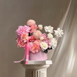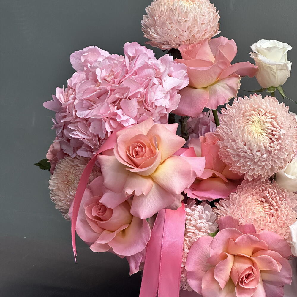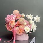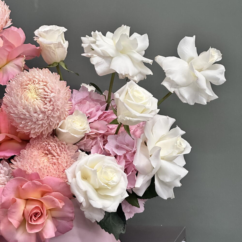White rose - 150 pcs pink hydrangea - 4 pcs medium box - 1 pcs pink roses - 150 pcs chrisantimum big - 4 pcs