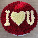 A stunning, large, circular floral arrangement in a white box, often referred to as a hatbox arrangement. It features an abundance of fresh garden roses. Color Scheme: The majority of the arrangement consists of vibrant red roses, forming the background. Design: White roses are meticulously arranged in the center to spell out I [heart symbol] U. Symbolism: This luxury design is commonly used to express love for occasions such as Valentines Day or anniversaries, harmonizing the passion of red with the purity of white roses.