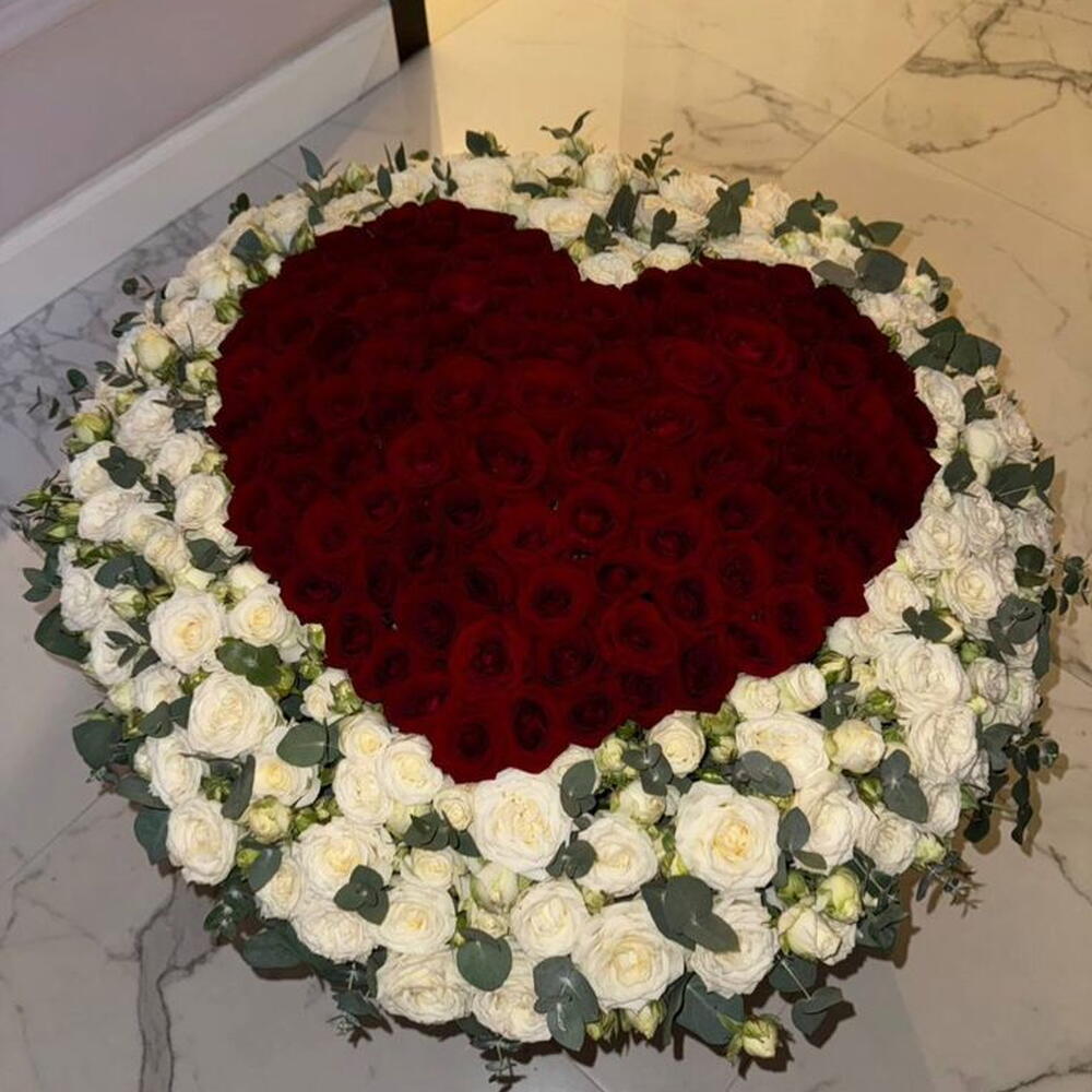 The arrangement is shaped like a large heart, with a dense center of red roses. Flowers: The central red heart is encircled by a border of numerous white roses and some green foliage, likely eucalyptus leaves. Purpose: This type of arrangement is often used for significant occasions, such as romantic gestures, anniversaries, or sometimes as a sympathy tribute.