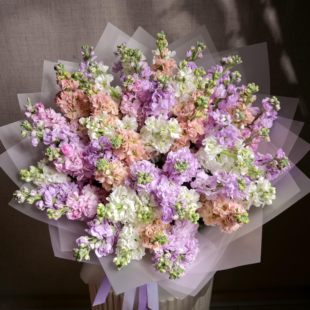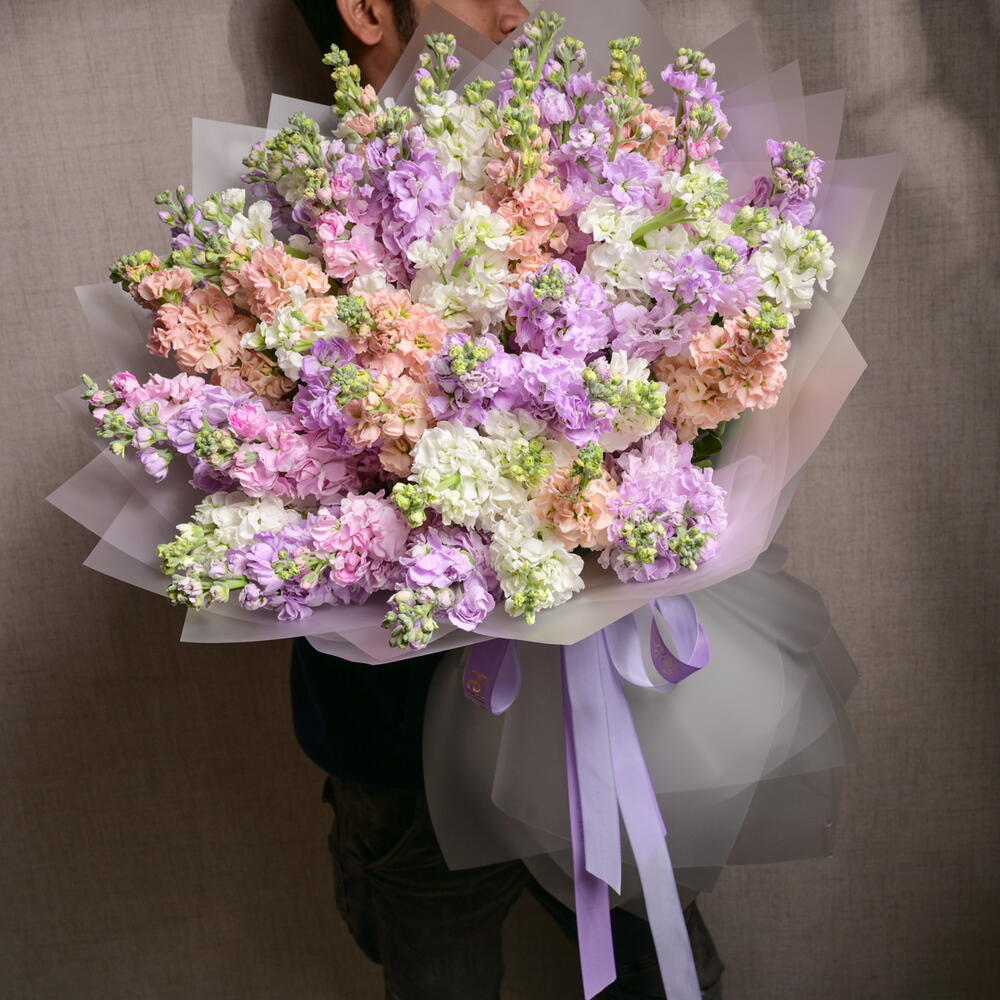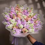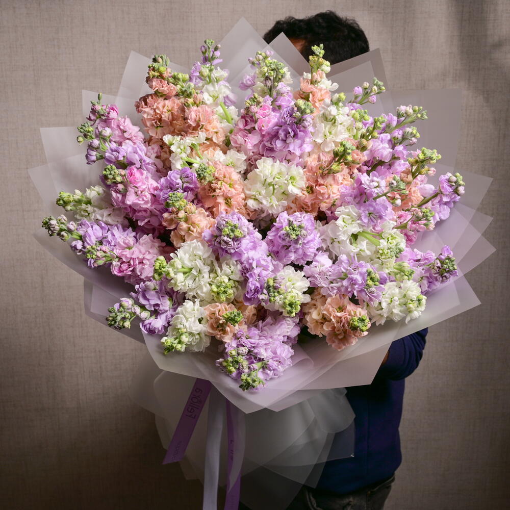The 51 Mixed Color Matthiola Bouquet is a stunning combination of soft pastel colors, featuring a beautiful blend of lavender, peach, and white matthiola flowers. This bouquet is a perfect representation of elegance and freshness, making it an ideal gift for celebrations or as a decorative centerpiece.
