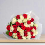 Delight in the stunning symphony of 26 lavish white roses contrasted splendidly by 25 exquisite red roses, artistically arranged. This floral arrangement is adorned elegantly with a singular white wrapping and a charming red ribbon; a florists masterpiece designed to captivate hearts. Perfect for expressing love, celebrating milestones or simply making any day special.