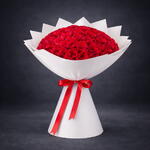 51 red roses blooming bouquet in white wrapping