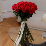 51 rich red roses. These roses are a timeless expression of love and devotion. Their vibrant crimson hue exudes passion and romance, while their enticing aroma captivates the senses. Whether its a special anniversary, a declaration of love, or simply a gesture of deep admiration, this bouquet is the perfect choice to leave a lasting impression. Elevate any occasion with this charming score of natures splendor.