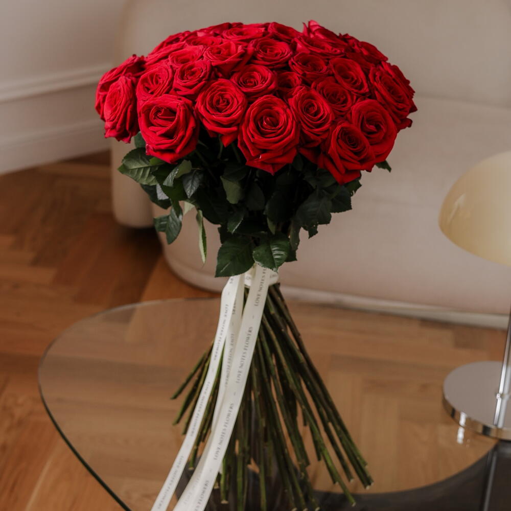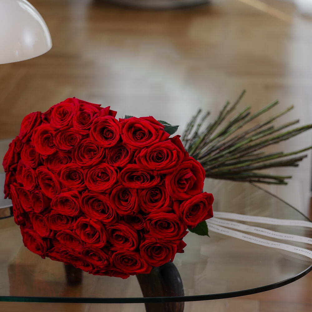 51 rich red roses. These roses are a timeless expression of love and devotion. Their vibrant crimson hue exudes passion and romance, while their enticing aroma captivates the senses. Whether its a special anniversary, a declaration of love, or simply a gesture of deep admiration, this bouquet is the perfect choice to leave a lasting impression. Elevate any occasion with this charming score of natures splendor.