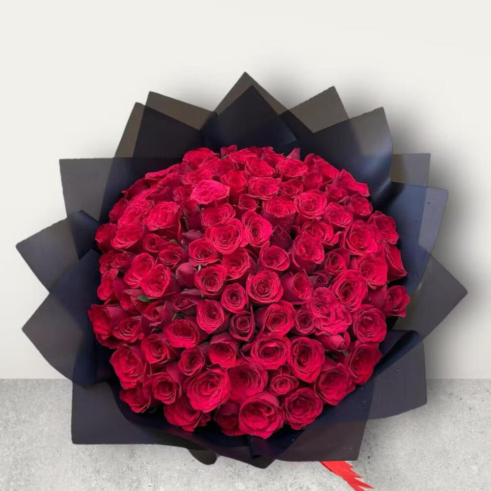 Des - Beautiful bouquet of 51 Red Roses in black wrapping.