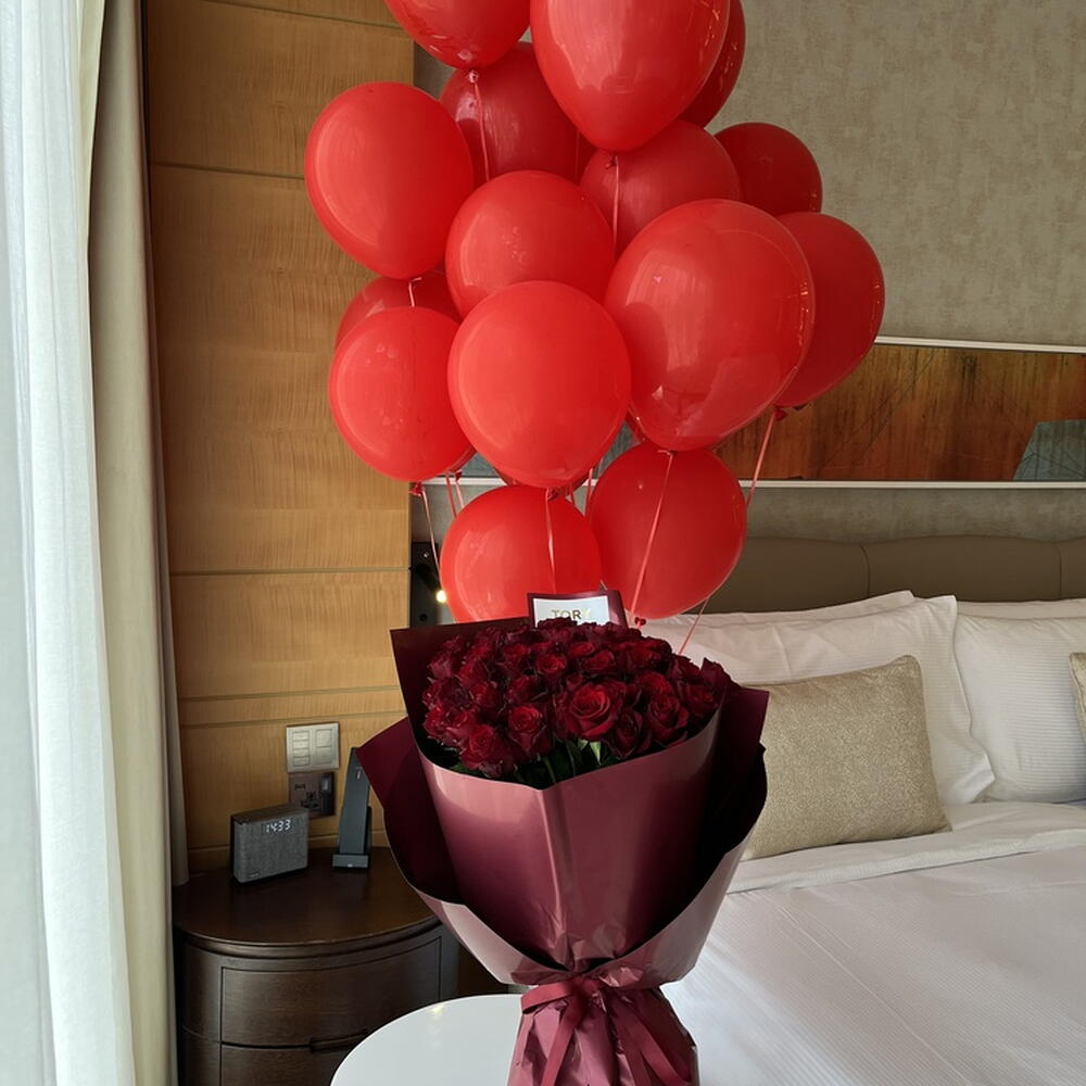 Composition: red roses - 51, red balloons - 20 Sizes: WIDTH - 45CM; HEIGHT - 60CM; LENGTH - 60CM; (including packaging) Size: 45 x 60 x 60 cm