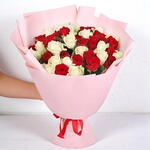 Celebrate timeless love and elegance with our 51 Red and White Roses Mix Bouquet, beautifully wrapped in soft pastel pink and tied with a satin ribbon. This premium hand-tied arrangement features 26 passionate red roses and 25 classic white roses, symbolizing romance and purity. Ideal for anniversaries, proposals, birthdays, or any heartfelt occasion, this bouquet delivers a message of perfect harmony. Care Instructions: Trim the stems at a diagonal and place the roses in a clean vase filled with fresh water. Refresh the water daily and keep the bouquet in a cool spot away from direct sunlight. Avoid placing near ripening fruit or heaters to extend the freshness and fragrance.