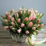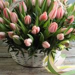 Ribbon - 1 pcs Tulips - 51 pcs Basket - 1 pcs Leaves - 5 pcs floral foam - 2 pcs