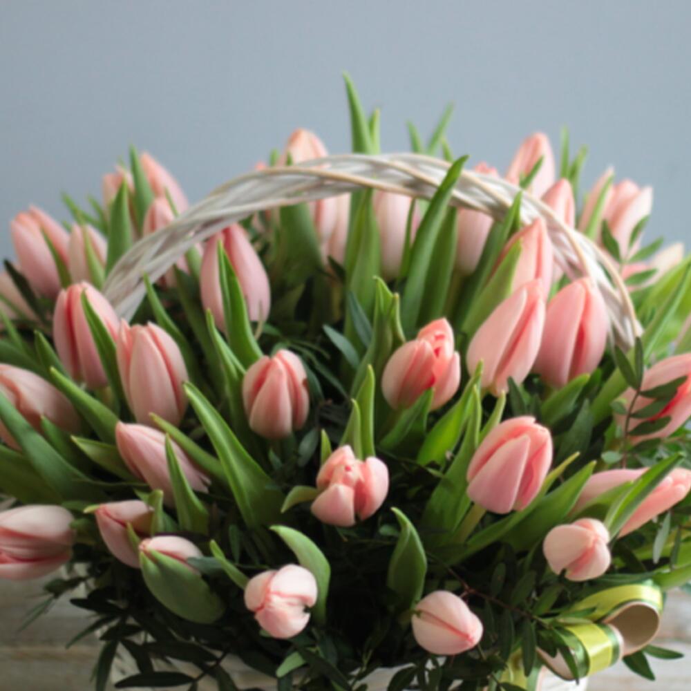 Ribbon - 1 pcs Tulips - 51 pcs Basket - 1 pcs Leaves - 5 pcs floral foam - 2 pcs