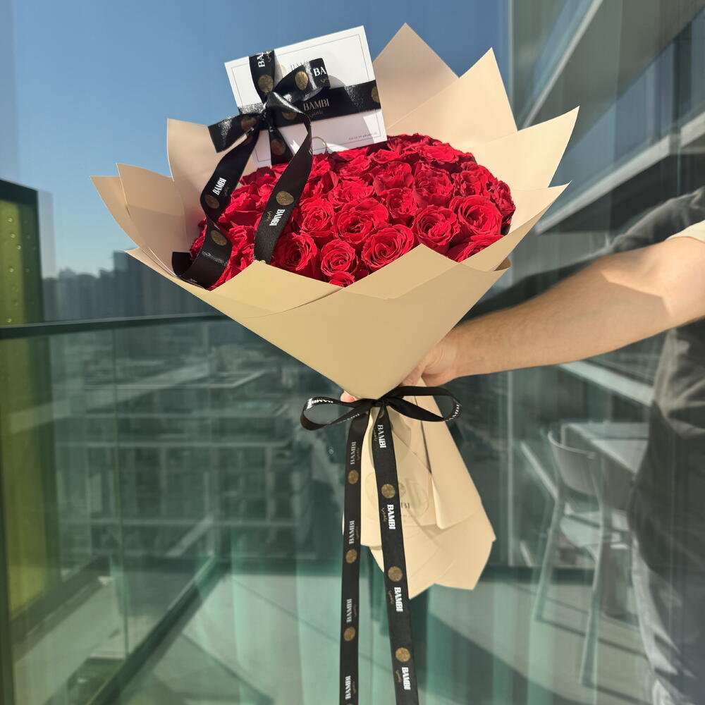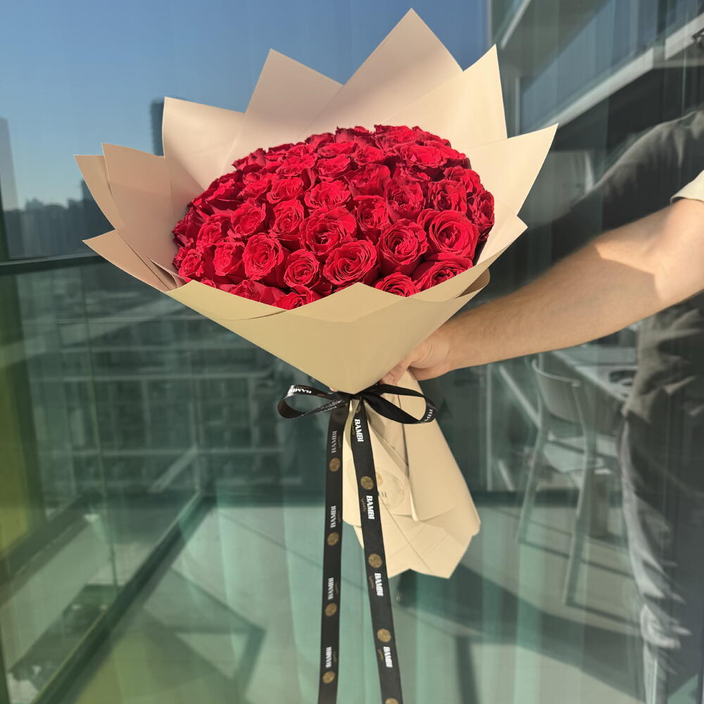 This stunning mono bouquet is curated with 55 hand-picked red roses, masterfully bundled and wrapped elegantly in a cream wrap. Gracefully tied with a single sleek black ribbon, this bouquet plays the perfect symphony of love and passion. To make your gift even more personal, it comes with a beautifully designed message card ready to articulate your deep sentiments. Simple, classic, and expressively charming, this bouquet is a perfect love gesture to make a lasting impression.