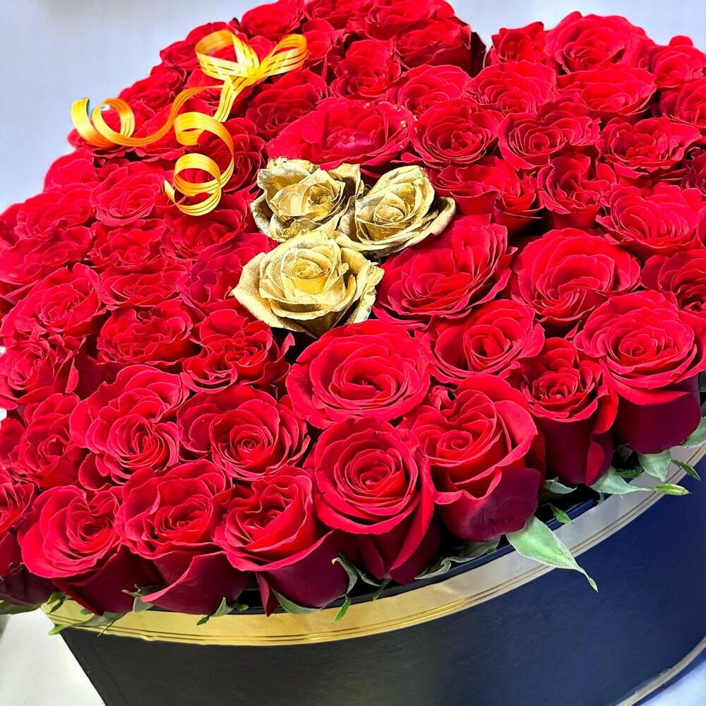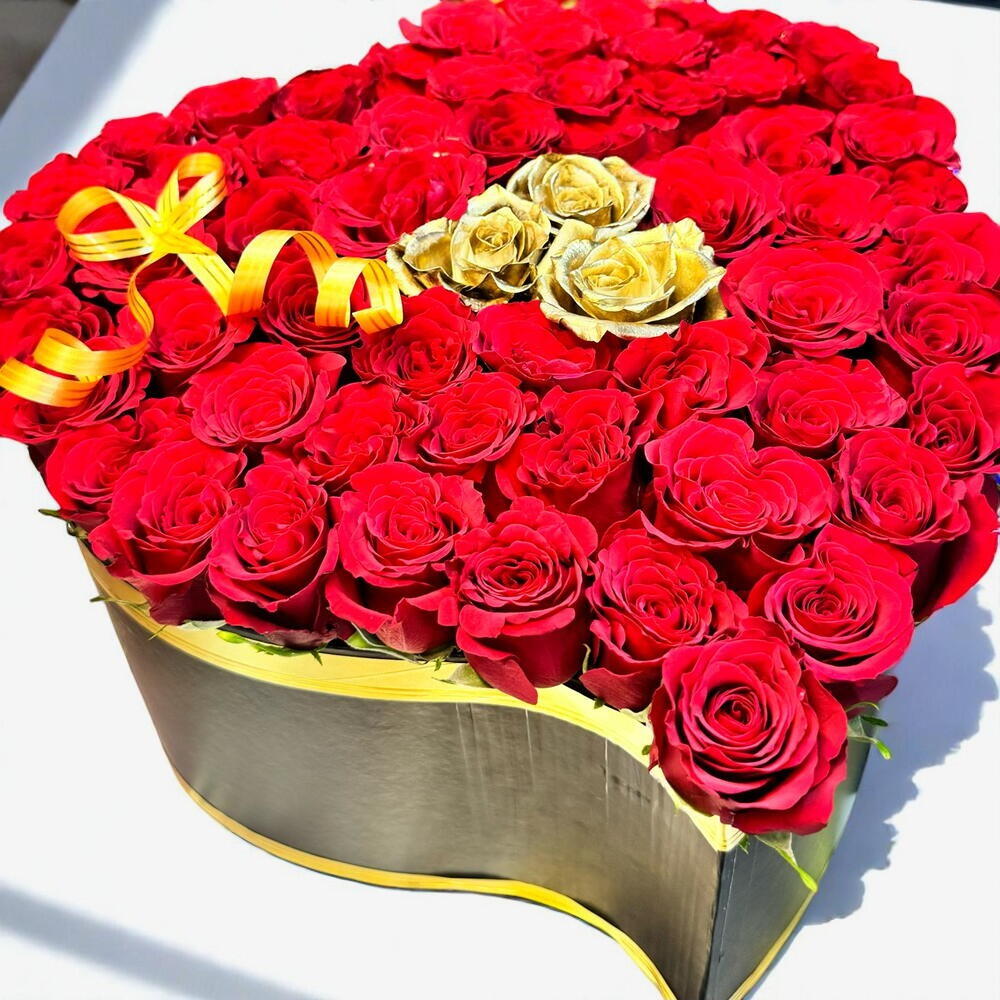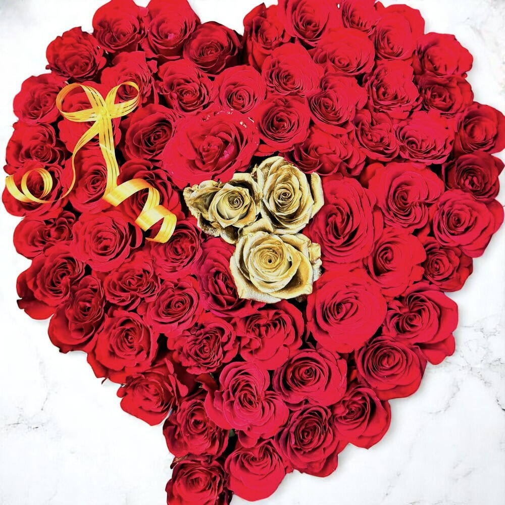 Express your love in the most unforgettable way with our Golden Heart of Love bouquet. This luxurious heart-shaped floral arrangement features 67 velvety red roses symbolizing passion and romance, elegantly accented by 3 radiant golden roses at the center, representing uniqueness, admiration, and lasting commitment. Care Instructions: Place the arrangement in a cool, shaded area away from direct sunlight and heat sources. Mist the roses lightly with water every 1–2 days to maintain freshness. Ensure good airflow around the bouquet and avoid excess moisture in the box.