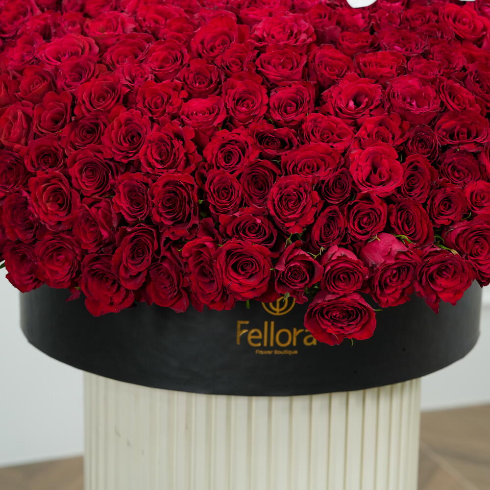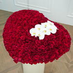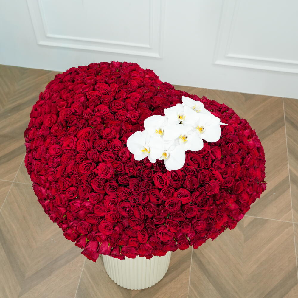 701 premium red roses arranged in a luxurious large black box with elegant Phalaenopsis orchids. A grand heart-shaped floral arrangement perfect for romantic occasions, proposals, and special celebrations. Expertly handcrafted using fresh, high-quality roses for a rich, long-lasting impression. Ideal luxury flower gift in Dubai for Valentine’s Day, anniversaries, and unforgettable moments.