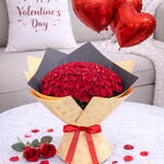 Des - Beautiful heart touching Bouquet of 75 Red Roses in Plain Black Peach Heart Wrapping tied with a Red Ribbon Bow Set of 5 Red Heart Shape Foil Balloons.