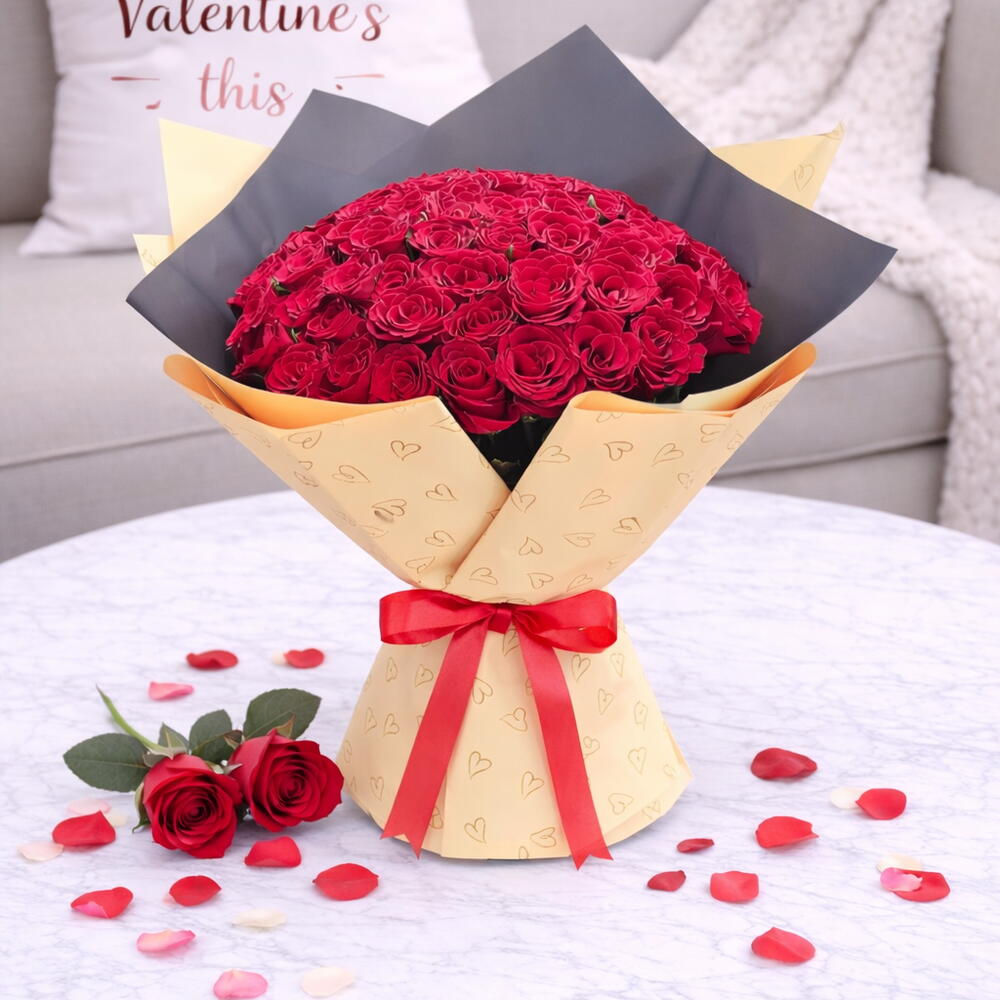 Des - Beautiful heart touching Bouquet of 75 Red Roses in Plain Black Peach Heart Wrapping tied with a Red Ribbon Bow.