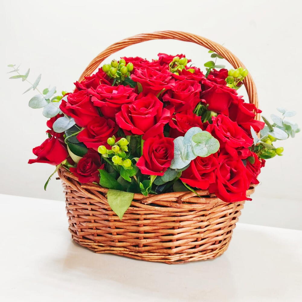 This exquisite Basket of 77 Red Roses is an epitome of elegance and love. Each rose is handpicked to ensure its freshness and beauty, creating a luxurious and dense bloom. This basket can serve as an impressive centerpiece or a grand gesture of affection. Its not just a gift, but an experience that embodies passion, admiration, and romance.
