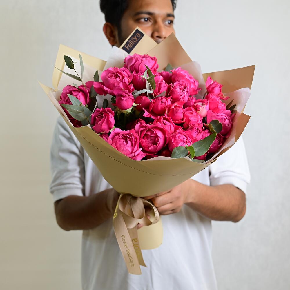 Make a bold statement with our exquisite 9 Lady Bombastic Roses Bouquet. This stunning arrangement features nine luxurious Lady Bombastic roses, renowned for their full, velvety petals and striking colors, creating a breathtaking display that captures attention. One stem of spray roses may have 3 or 4 flowers.