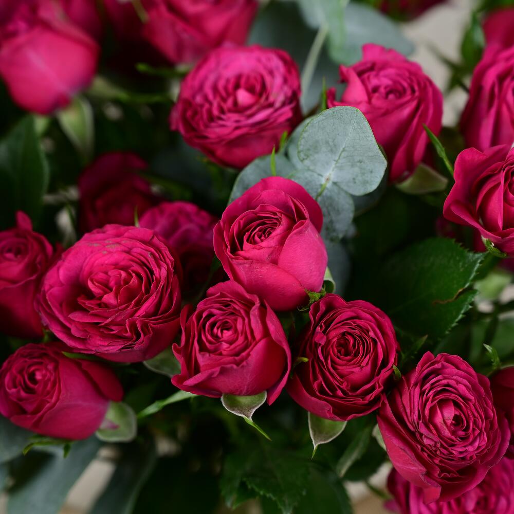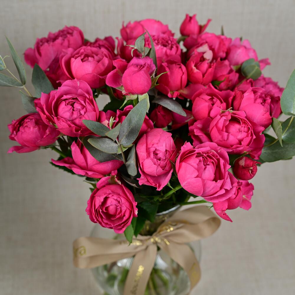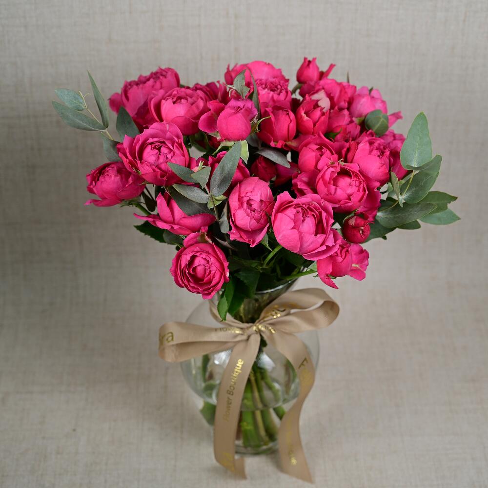 Make a bold statement with our exquisite 9 Lady Bombastic Roses in a Glass Vase. This stunning arrangement features nine luxurious Lady Bombastic roses, celebrated for their vibrant colors and full, velvety blooms, elegantly presented in a clear glass vase. One stem of spray roses may have 3 or 4 flowers.