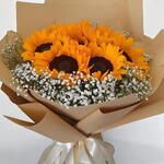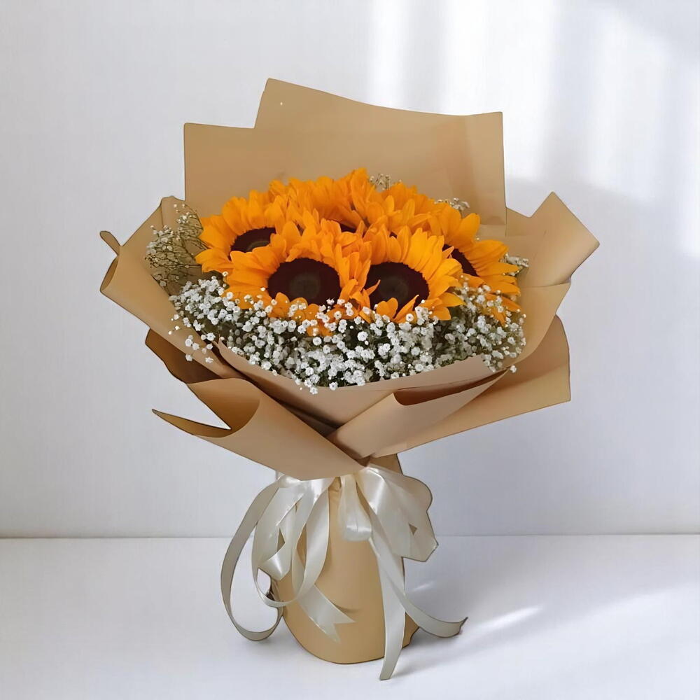 Brighten someone’s day with the radiant charm of the Golden Glow Sunflower Bouquet, a cheerful arrangement featuring 9 vibrant sunflowers surrounded by delicate white gypsophila and fresh areca palm leaves. Wrapped in natural kraft paper and tied with a classic satin ribbon, this bouquet bursts with warmth, optimism, and sunshine—perfect for birthdays, congratulations, get-well wishes, or simply bringing joy to someones space. The combination of rustic textures and bold floral brilliance creates a heartfelt gift that captures natures joyful essence. Care Instructions: Trim the stems at an angle before placing the bouquet in a clean vase with fresh water. Change the water every 2 days and keep the bouquet in a cool, shaded area away from direct sunlight and fruit. Remove any fading blooms to prolong the bouquet’s freshness.