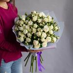 Bouquet of 9 stems white baby roses wrapped and and tied with a purple ribbon
