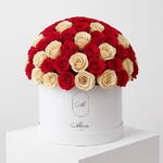 99 Red And Cream White Rose Luxurious Anniversary Hat Box Arrangement