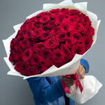 Immerse yourself in the world of magnificent beauty with this lush bouquet of 99 vibrant red roses. Each rose has been carefully selected by our artisan florists for its breathtaking crimson hue and fresh, blooming petals. Nestled in an exquisite double-folded white wrapping, this grand bouquet is tied with a single sumptuous red ribbon, adding a touch of elegance. It is the perfect gift to express your deepest emotions and etch an unforgettable moment in their heart.