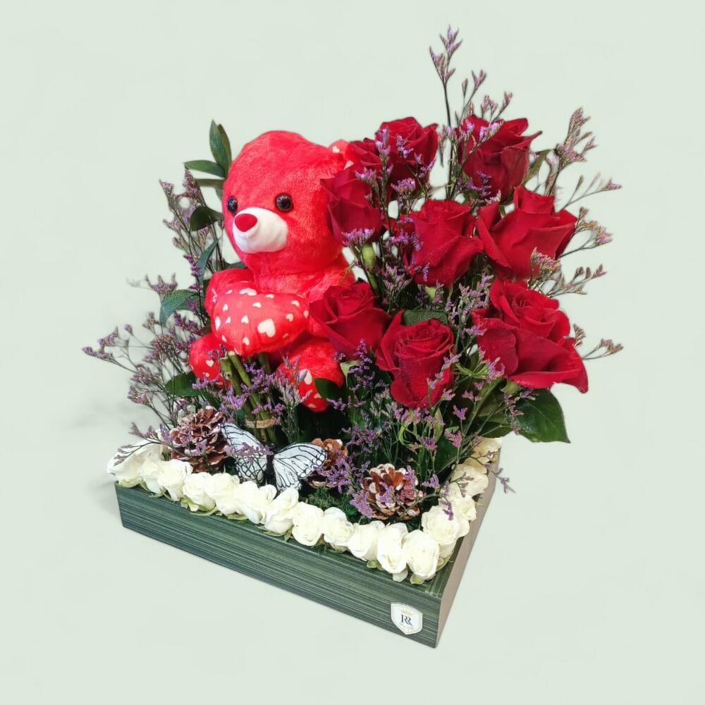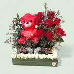 A heartfelt arrangement featuring rich red roses and delicate purple statice, complemented by a charming red teddy bear and a border of small white roses, all presented in a rustic box.