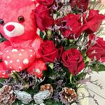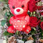 Ruscus - 4 pcs Limonium - 5 pcs Teddy bear - 1 pcs butterfly - 1 pcs pine cones - 3 pcs roses - 8 pcs baby roses - 5 pcs