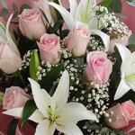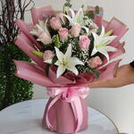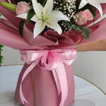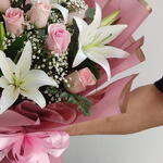 An enchanting blend of 11 pink roses and 4 white lilies—elegant, serene, and photo-ready. Elegance, distilled. Eleven delicate pink roses meet four pristine white lilies in a bouquet that balances romance with poise. Finished with seasonal greens and luxury wrapping, this piece whispers grace—perfect for birthdays, congratulations, get-well wishes, or any moment that deserves soft, timeless beauty. 11 × Pink Roses 4 × White Lilies* Seasonal greens luxury wrap + satin bow Hydration pack care card *Lilies often arrive in bud for longer enjoyment; gentle fragrance, pollen to be removed once open. Approx. Size: 42–50 cm (H) × 30–38 cm (W) Palette: Blush pink, crisp white, fresh greens Care Tips: Keep cool and upright. Recut stems at 45° before placing in fresh water; change water daily. Remove lily pollen on opening to keep petals spotless. Send quiet luxury—order now