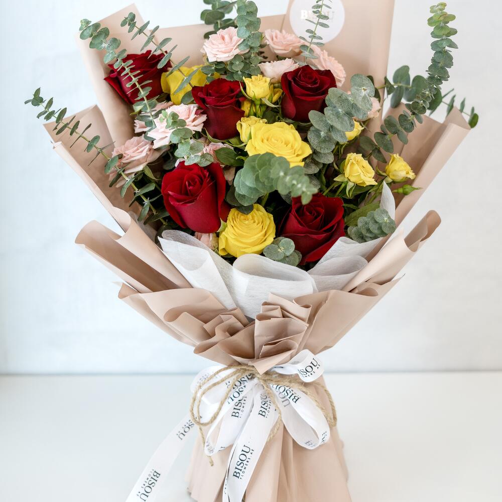 Red rose - 5 pcs Yellow rose - 3 pcs yellow spray rose - 2 pcs peach spray rose - 4 pcs