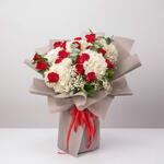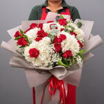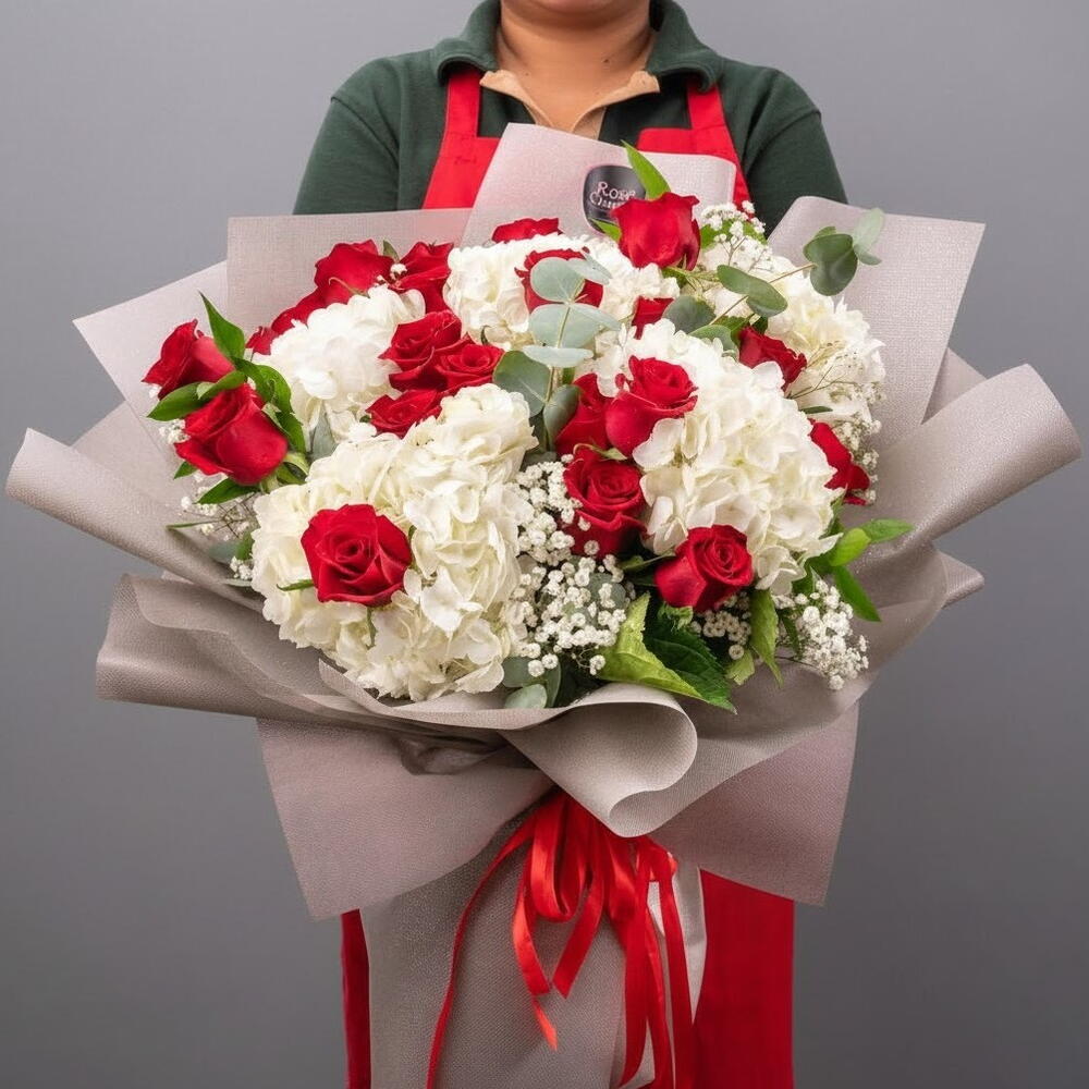 Make a statement with this luxurious bouquet of 21 red roses and 5 white hydrangeas. Wrapped elegantly with paper and ribbon, this arrangement is perfect for expressing love and admiration on any occasion.