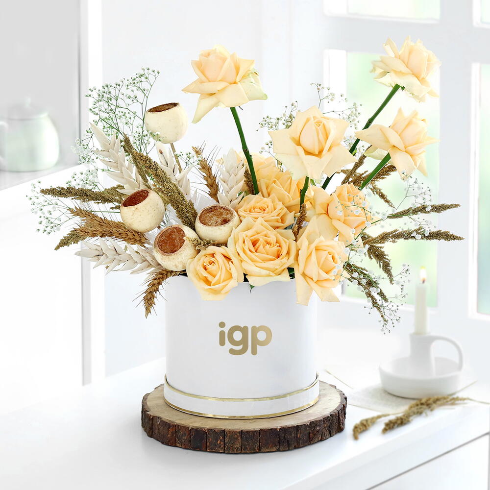 Get mesmerized with a melange of fresh and dried collection of apple wood, wheat grass, millet dry, corkwood flowers, peach roses and gypso deftly packed in a white box. Its quiet simplicity echoes floral brilliance that carries your best wishes to loved ones.