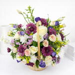 Ruscus - 5 pcs Solidago - 3 pcs white carnations - 3 pcs purple eustoma - 3 pcs purple chrysanthemums - 2 pcs wicker basket - 1 pcs pink statice - 3 pcs pink spray roses - 4 pcs white mathiola (stocks) - 3 pcs