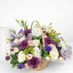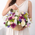 A delicate expression of beauty and charm, this enchanting arrangement features a harmonious blend of white mathiola (stocks), purple eustoma, white carnations, pink statice, purple chrysanthemums, pink spray roses, and solidago, complemented by fresh ruscus foliage. Artfully arranged in a classic wicker basket, this design embraces a soft pastel palette and a naturally flowing style, creating a graceful and soothing visual appeal. Perfect for thoughtful gifting, celebrations, or adding a touch of refined elegance to any space.