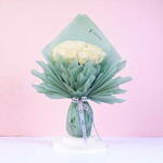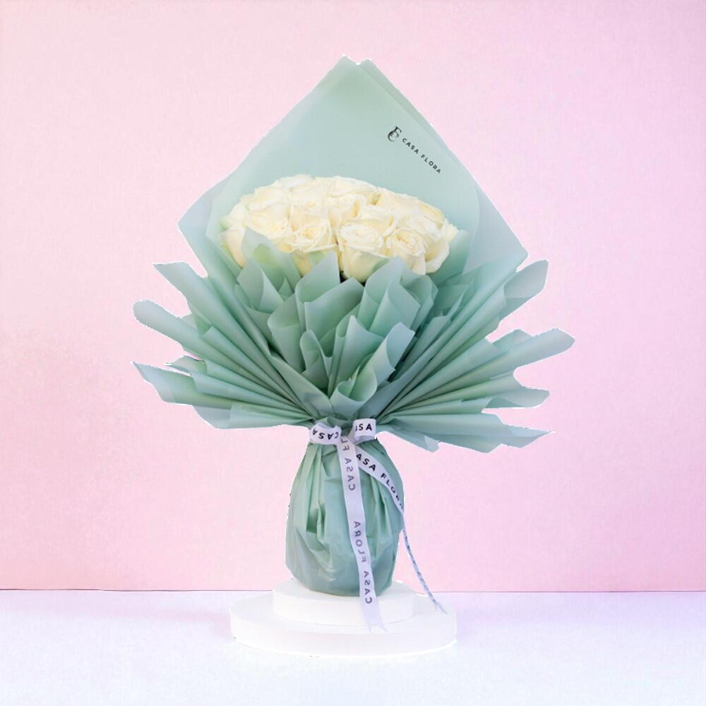 This combination of deep and the soft 25 white roses Medium size elegant Tiffany wrapping creates a stunning contrast and a sophisticated visual appeal. It’s a perfect gift for someone who appreciates luxury and beauty!