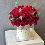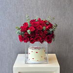 Elegant acrylic box featuring a 300 grams cake paired with beautiful red roses Available in vanilla chocolate and pistachio flavours for a perfect celebratory gift