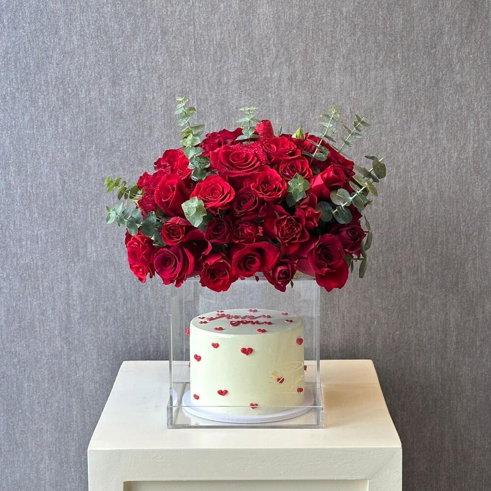Elegant acrylic box featuring a 300 grams cake paired with beautiful red roses Available in vanilla chocolate and pistachio flavours for a perfect celebratory gift